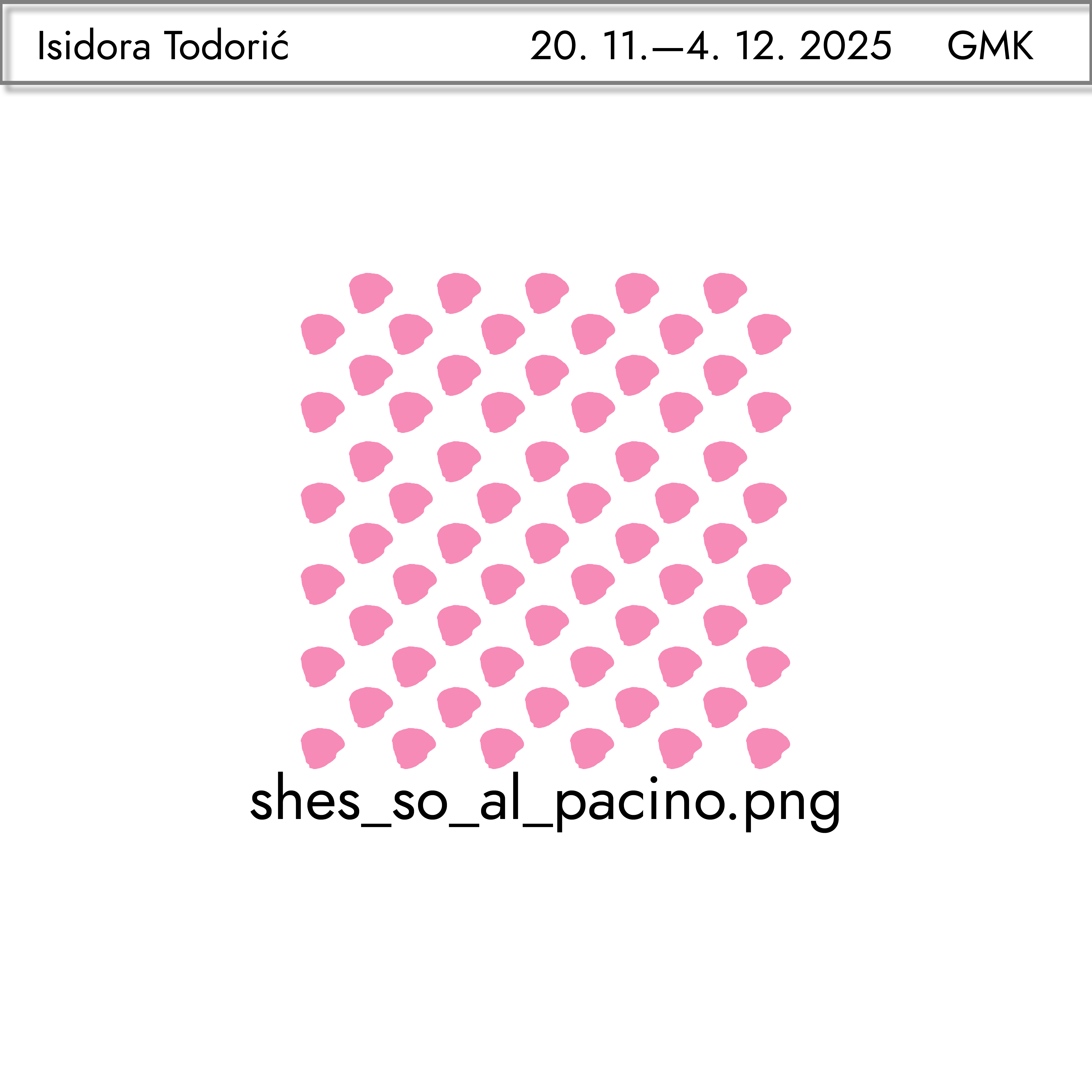“shes_so_al_pacino.png” ujedno uvodi novi smjer u Isidorinu praksu. Dok su raniji radovi istraživali mitološke, ritualne ili jezične strukture, ovdje se pažnja usmjerava na samu povijest pogleda. Polazište je zapadna kinematografija, imaginarij koji se, generacijama unatrag, utisnuo i u naš kolektivni pogled, u naše (prešutne) ideale i u naše pretpostavke o tome tko smije/može biti junak. Ovaj postav tu tradiciju ne ruši. Jednostavno je rastvara. Raster koji prekriva prostor postaje metaforička podloga za brisanje moći slike. U digitalnom jeziku on znači “nema ništa”, no u Isidorinoj interpretaciji predstavlja točku iz koje su protagonisti uklonjeni, doslovce.